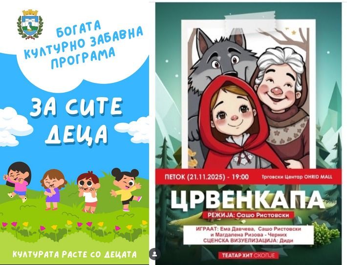 Post Views: 81 Како дел од програмата на Општина Охрид, Културата расте со децата „За сите деца“, овој петок ќе биде прикажана детската претстава „Црвенкапа“.– Целосната приказна „Црвенкапа“ е целосно адаптирана во театарска претстава и ги задржува оргиналните делови и секако оргиналните ликови: Црвенкапа, бабата, волкот и ловџијата. Низ многу убави театарски моменти, познати за децата, оргинални костими, сценографија и музика, педагошки, интерактивни и комични моменти ќе се приреди една оргинална театарска хит претстава каде децата ќе ја слушнат и до нив ќе допре и јасно...