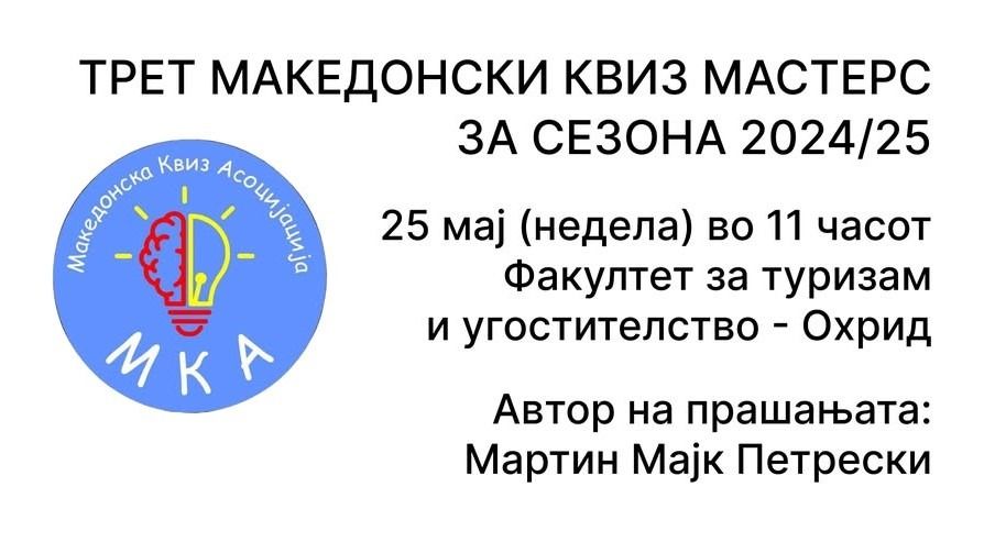 Post Views: 122 Македонската квиз асоцијација (МКА) го најави завршниот Мастерс квиз за оваа сезона, кој ќе се одржи утре со почеток во 11:00 часот, во просториите на Факултетот за туризам и угостителство во Охрид.Традиционалниот настан по трет пат го носи елитниот квизерски дух на македонската сцена токму во Охрид, најдобрите квизаџии од земјата ќе имаат можност да ги одмерат своите знаења низ широк спектар на теми: култура, забава, историја, животен стил, медиуми, наука, спорт и свет. Организаторите информираат дека секој учесник ќе одговара на вкупно 200...