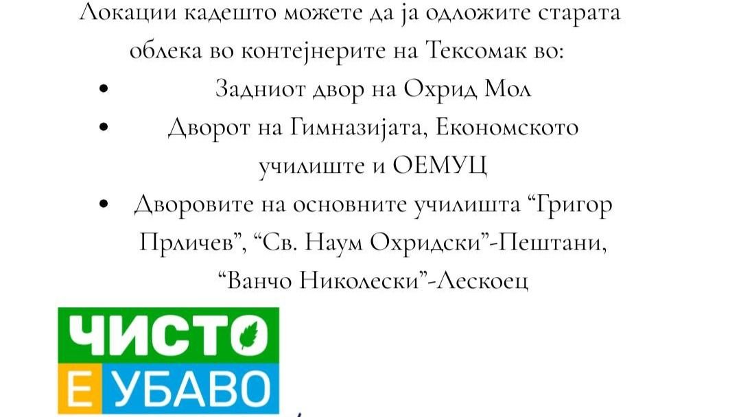 Post Views: 60 Од ЈП Охридски Комуналец информираат за утрешната акција за одложување стара облека во контејнерите на Тексомак коишто се поставени во задниот двор на Охрид мол, дворот на Гимназијата, Економското училиште и ОЕМУЦ, како и дворовите на основните училишта „Григор Прличев“, „Св. Наум Охридски“ Пештани, и „Ванчо Николески“ Лескоец.–Запомнете дека одлагањето во дворовите на основните и средните училишта ќе биде возможно во рамките на работното време. Не се одлагаат стари обувки, чанти, итн., се додава во соопштението од претпријатието.