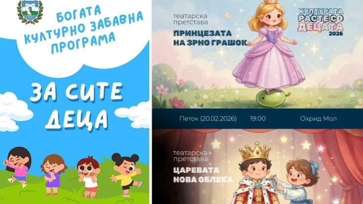 Post Views: 128 Денес со почеток од 19:00 часот во Охрид Мол, како дел од детската програма на Општина Охрид за најмладите, Културата расте со децата „За сите деца“, драмското студио „ЦВЕТ 75“ ќе одигра две театарски претстави „Принцезата на зрно грашок“ и „Царевата нова облека“Улогите во детските престави ги толкуваат Никола Боцевски, Сара Арнаудова, Софи Петреска, Софија Тасеска, Јаков Трпески, а режијата и сценариото се на Драгана Боцеска.