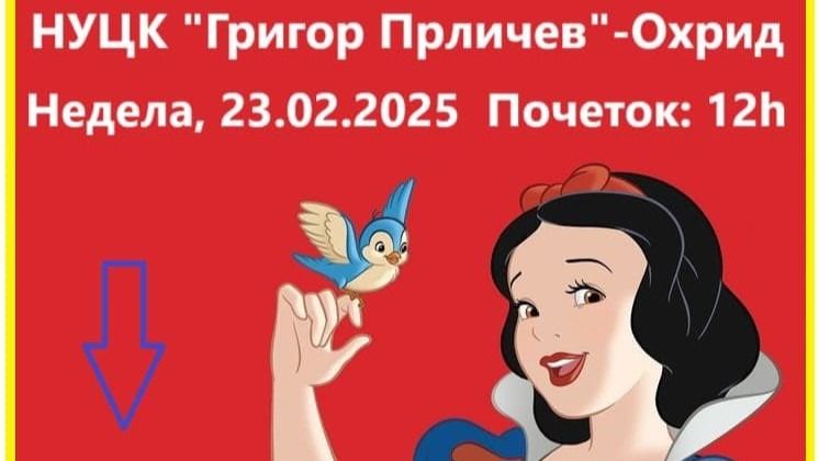 Post Views: 264 На далеку прочуениот “Весел Театар” доаѓа во Охрид, со театарската претстава за деца “Снежана и нејзиниот принц” – претстава, коja како што велат организаторите, по неколку пати ги полни салите низ цела Македонија. По барање на охридската публиката, закажана е оваа атрактивна детска театарска претстава за утре, недела 23 февруари, во НУЦК “Григор Прличев” – Охрид, со почеток во 12h.Претставата ќе биде изведена во живо, пропратена со новокомпинирани детски музички песни, кои се специјално креирани за оваа детска претстава.Резервации можат да се направат...