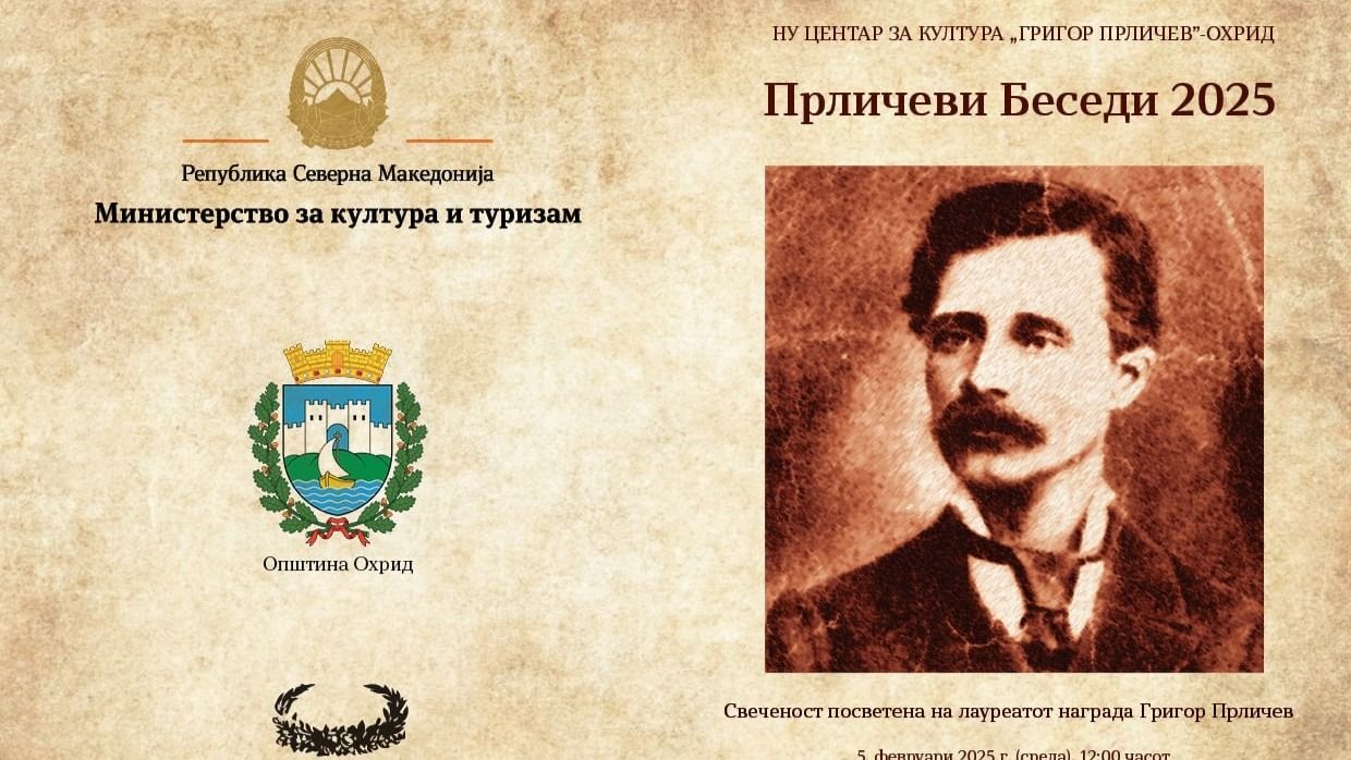 Post Views: 182 Богата програма за годинашната традиционална манифестација „Прличеви беседи“, со што ќе се одбележи годишнината од смртта на поетот и преродбеник Григор Прличев.Чествувањата ќе започнат среда 5 февруари 2025 година во 11:45 часот со изложба на ликовни дела од колекцијата на НУЦК Охрид во Изложбениот салон.Во 12:00 часот предвидена е Свеченост посветена на лауреатот награда ГРИГОР ПРЛИЧЕВ и настап на хорот при НУЦК “Григор Прличев”- Охрид, изведба на 1762 лето, како и обраќање на претставници од НУЦК “Григор Прличев”- Охрид и Општина Охрид. Ќе биде...