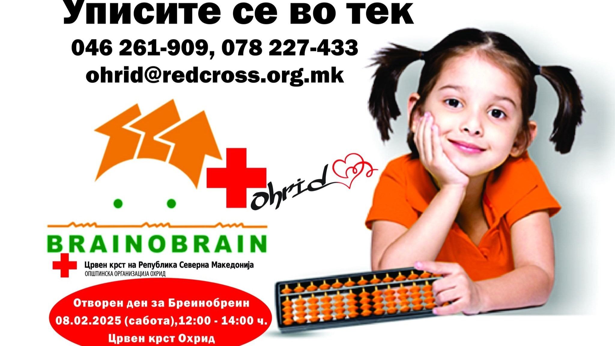 Post Views: 181 Во тек се зимските уписи во Центарот за развивање на животни вештини БРЕИНОБРЕИН-Црвен крст Охрид за деца од 4-14 годишна возраст. Заинтересираните лица може да ја следат интернационалната Бреинобреин едукативна програма преку која ќе имаат можност да ги стекнуваат, развиваат и потврдуваат своите способности: концентрација, меморија, нумерички и вербални вештини, способности за учење, креативност и имагинација, лидерство, самодоверба, визуелизација, решавање на проблеми.Детални информации за оваа програма заинтересираните ќе можат да добијат на отворениот ден...