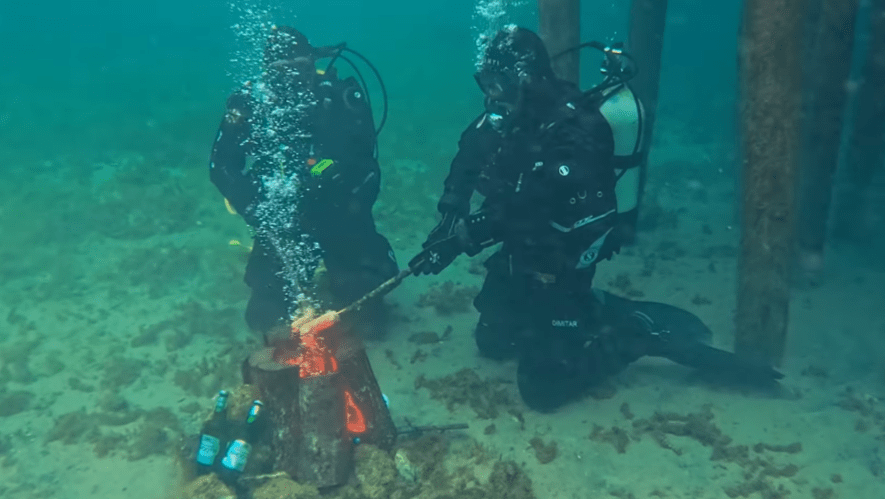 Post Views: 301 Традиционално и на уникатен начин нуркачите од „Амфора“ кај Музејот на вода ја прославија Православна Нова година со оган на кој печеа колбаси под вода.