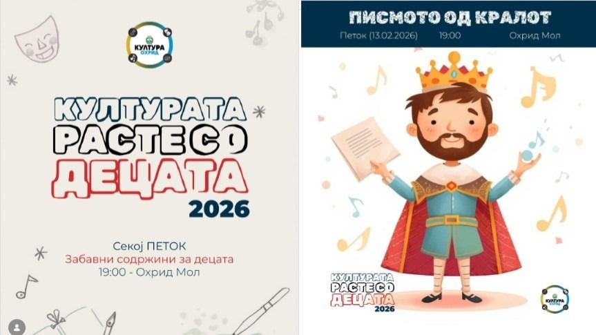 Post Views: 104 Продукција ТРИАНГЛ за најмладите носи интерактивна музичко-драмска претстава со изведба и музика во живо, полна со хумор и едукација, насловена „Писмото од кралот”.Во раскошниот дворец на „Охрид Мол“ приказната започнува со пристигнување таинствено писмо од кралот. Со помош на публиката и многу музички моменти, создаваат вистинска училница на култура и еколошка свест. Преку игра, песна и интеракција, „Писмото од кралот“ пренесува важни едукативни пораки за бонтон и општествена култура, грижа за животната средина, како и за вредноста на почитта и...