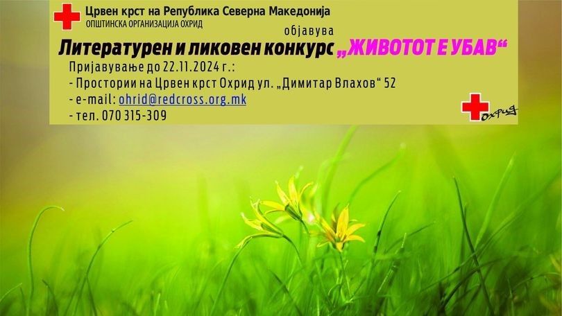 Post Views: 118 Денес со почеток во 12:30 часот во просториите на Црвен крст Охрид ќе бидат дoделени наградите од конкурсот “Животот е убав“.На конкурсот можеа да учествуваат учениците од основните и средните училишта на општините Охрид и Дебарца и друга популација, со поезија, проза и ликовна уметност.Од Црвен крст Охрид информираат дека на овогодинешниот конкурс пристигнати се вкупно 106 литературни и уметнички творби, а наградени се следните учесници:Поезија од I до V одд.-Прва награда – Јана Војдиноска – V одд. ООУ „ Кочо Рацин “ Охрид-Втора...