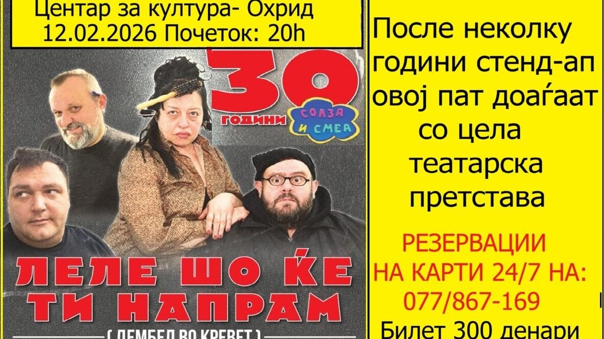 Post Views: 105 Денес во големата сала во Центарот за култура Григор Прличев „Солза и смеа” премиерно пред Охриѓани ќе ја изведат нивната најнова претстава “Леле што ќе ти напрам“.Се очекува салата, како и изминатите години, да биде исполнета до последно место од бројните љубители на нивниот хумор. Овојпат, наместо стендап-шоу, публиката ќе има можност да проследи целосна театарска комедија во која настапуваат четири добро познати ликови од урнебесните „Солза и смеа“.Билети може да се резервираат на телефонскиот број 077/ 867-169.