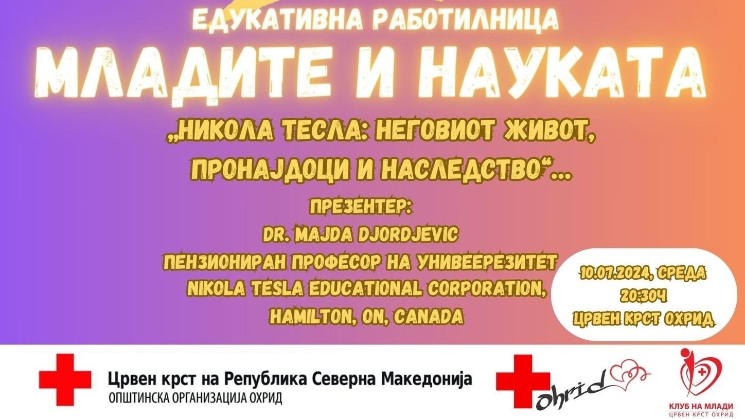 Post Views: 219 По повод 168 годишнината од раѓањето на големиот визионер и научник, Никола Тесла (род. 10.07.1856), Црвен крст Охрид во партнерство и соработка со организацијата Canadians For Children At Health Risk, од Торонто, Канада организира инспиративна, едукативна, онлајн работилница на тема МЛАДИТЕ И НАУКАТА, а со наслов „НИКОЛА ТЕСЛА: НЕГОВИОТ ЖИВОТ, ПРОНАЈДОЦИ И НАСЛЕДСТВО“.Домаќини на оваа работилница, која ќе се одржи на 10.07.2024 г. (среда) со почеток во 20:30 ч. во просториите на Црвен крст Охрид, ќе бидат младите волонтери од Клубот на млади на Црвен крст...
