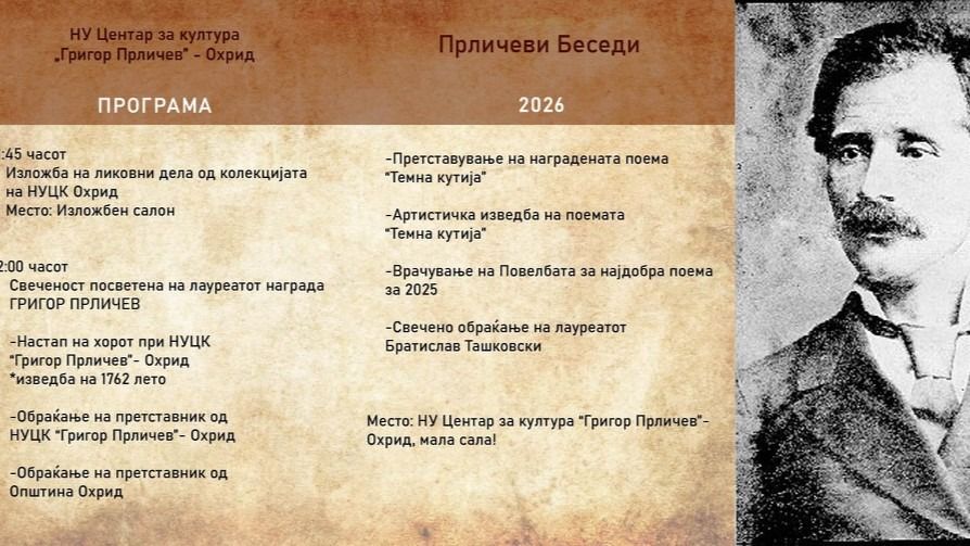 Post Views: 85 Во четврток, на 5 февруари 2026 година, во Охрид ќе се одржат „Прличевите беседи“, традиционална културна манифестација посветена на ликот и делото на Григор Прличев.Програмата започнува во 11:45 часот со изложба на ликовни дела од колекцијата на НУ Центар за култура „Григор Прличев“ – Охрид, поставена во изложбениот салон. Централната свеченост ќе се одржи во 12:00 часот во малата сала на НУЦК „Григор Прличев“ – Охрид.Свечената програма вклучува настап на хорот при НУЦК „Григор Прличев“, обраќања на претставници од Центарот за култура и Општина Охрид,...