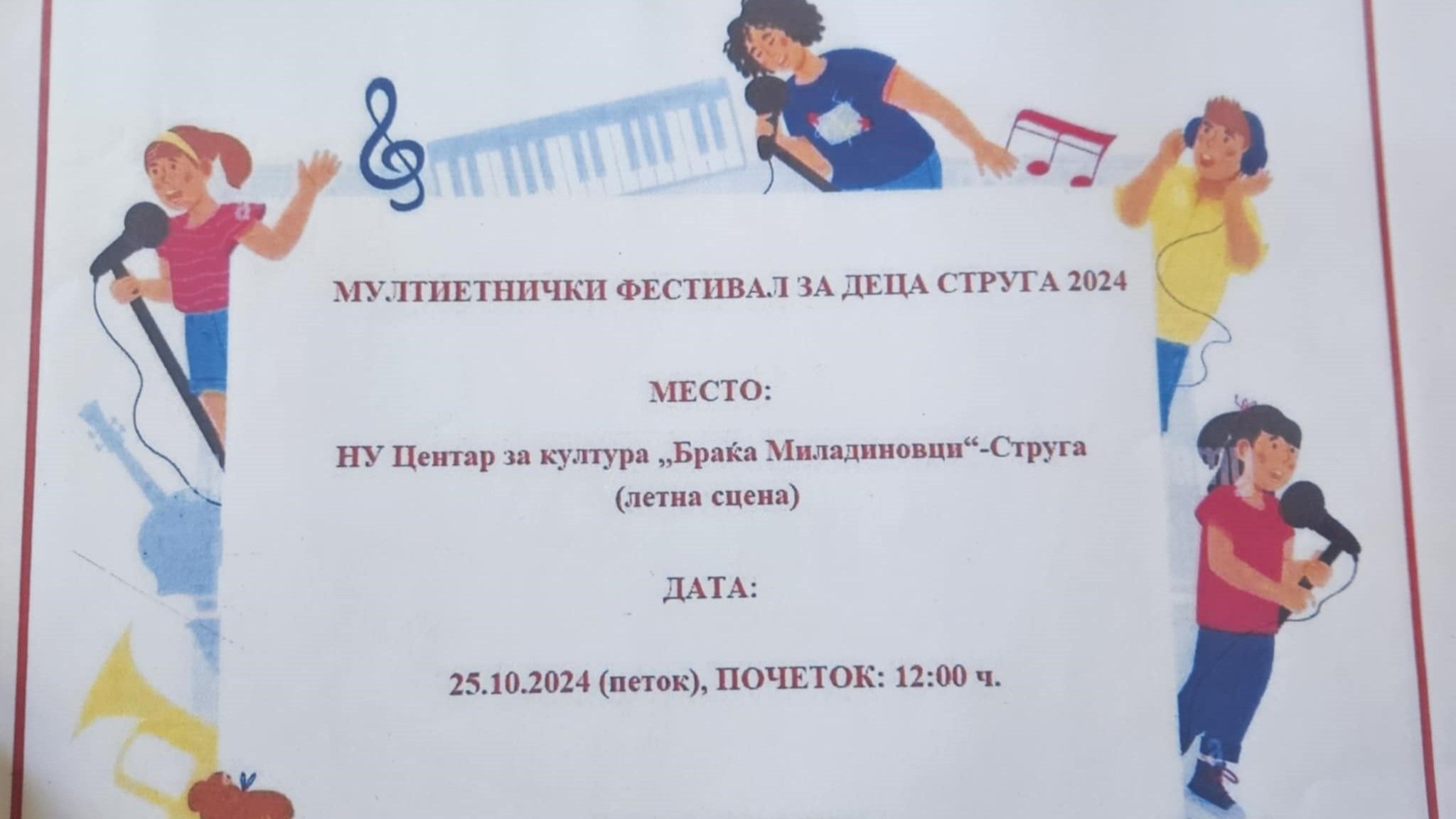 Post Views: 229 Денес со почеток во 12:00 часот на летната сцена во Центарот за култура „Браќа Миладиновци“ – Струга, ќе се реализира 14-тото издание на Мултиетничкиот фестивал за деца Струга 2024.Влезот е слободен, а присутните ќе имаат можност да уживаат во изведбите на детски хор, играорни и групи за модерен танц, посочуваат организаторите.