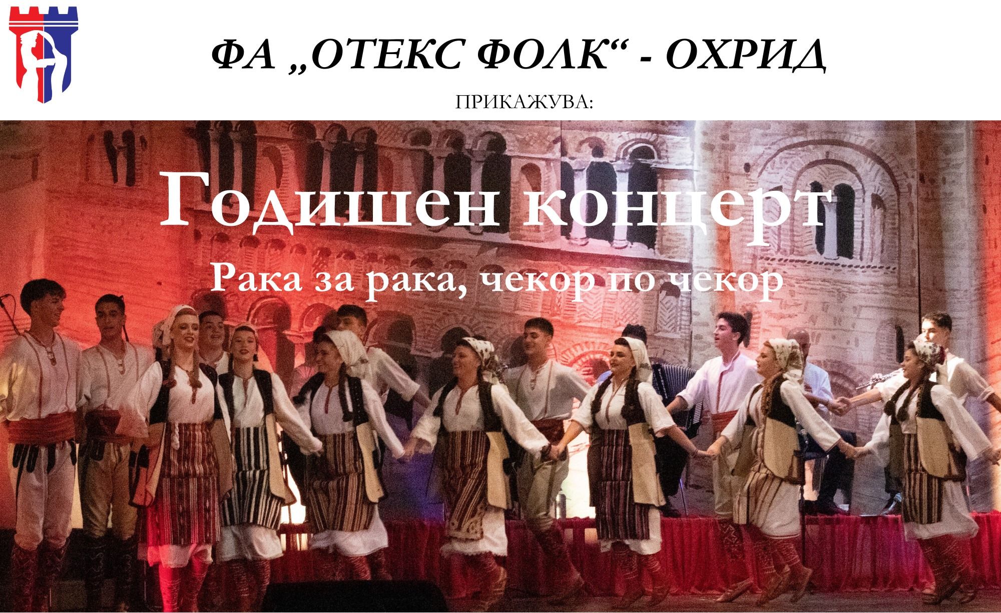 Post Views: 378 Фолклорниот ансамбл Отекс Фолк со годишен концерт насловен “Рака за рака, чекор по чекор” ќе го обележи работењето на фолклорната школа во изминатата школска година. Годишниот концерт ќе се одржи на 15-ти јуни (сабота) во Центар за култура „Григор Прличев“- Охрид со почеток во 15:00 часот.На овој концерт ќе настапат најмладите членови на ансамблот, средната група, како и и вториот состав кои што со голем ентузијазам и љубов ги изучуваа традиционалните фолклорни кореографии во изминатата школска година и ќе прикажат што се научиле од ризницата...