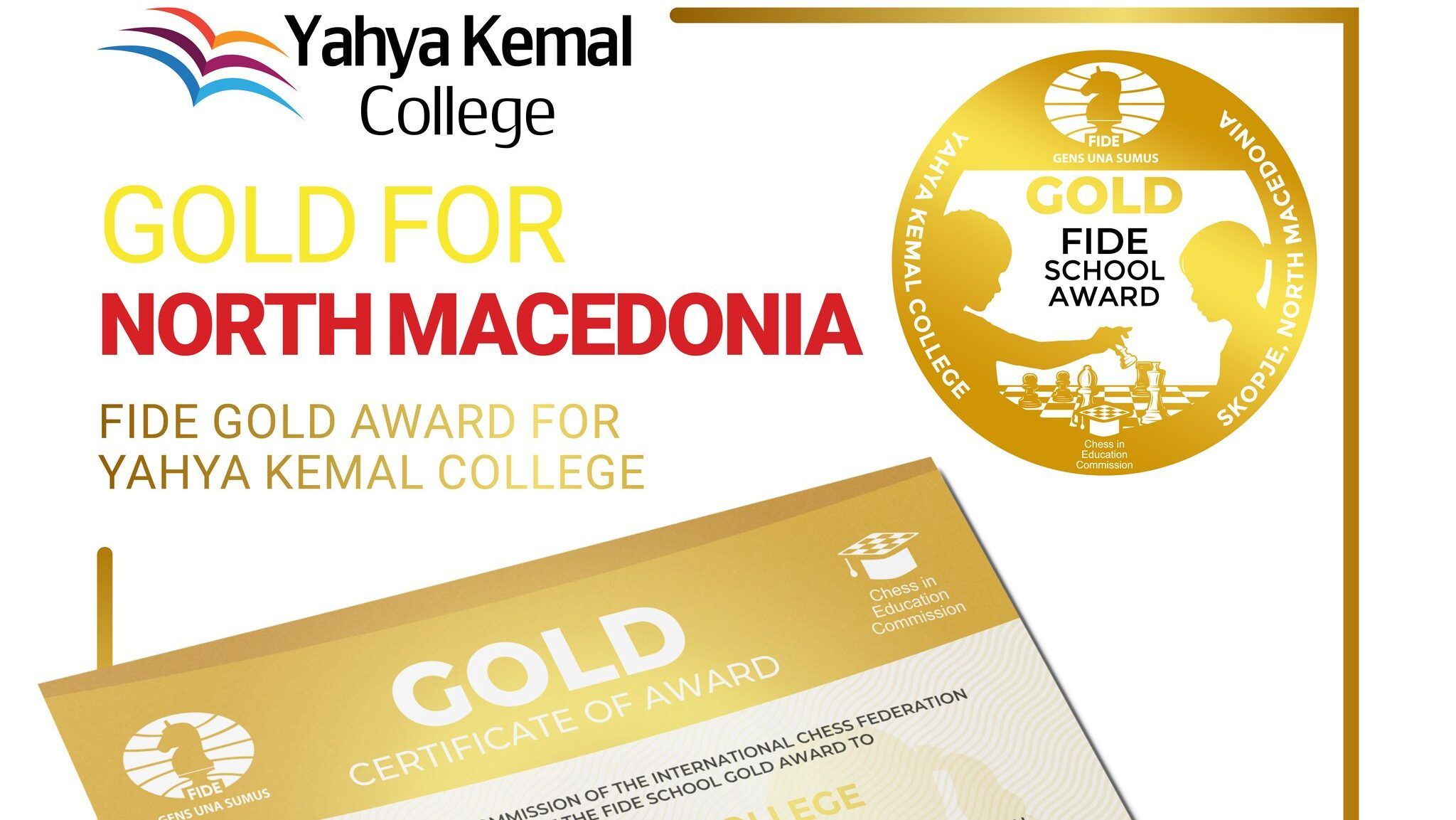 Post Views: 320 ПСУ „Јахја Кемал” и наставникот по шах Орце Данчевски се добитници на највисокото глобално признание од Светската шаховска федерација(ФИДЕ) за имплементирање на шах во училишната програма.Kомисијата за шах во образованието која, е дел од ФИДЕ, го сертифицираше Јахја Кемал со златен амблем по спроведеното оценување на десет критериуми и активности коишто овозможуваат успешно имплементирање на шахот како дел од образовната програма.Златната награда е доделена на ПСУ „Јахја Кемал” поради највисоко бодување на програмата за работа, материјалите и сеопфатноста...