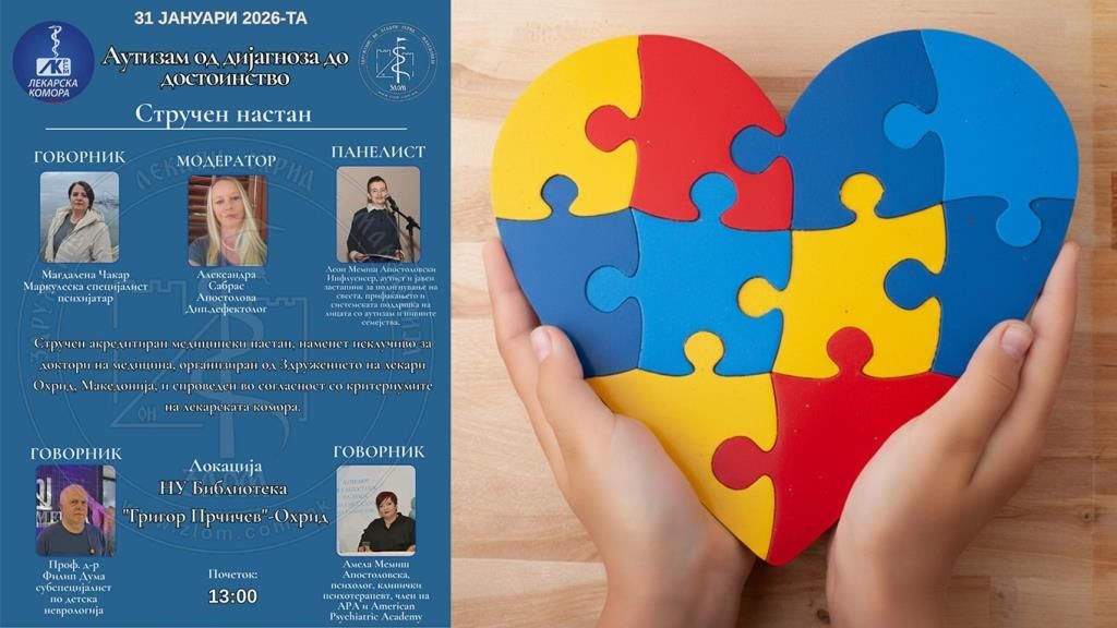 Post Views: 96 Денес во Охрид ќе се одржи стручен медицински, акредитиран настан за доктори на медицина, посветен на аутизмот-од дијагноза до поддршка за достоинствен живот.Истиот е насловен „Аутизам од дијагноза до достоинство“ и ќе се одржи во НУ Библиотека „Григор Прличев“ во Охрид, со почеток во 13:00 часот.Свои излагања ќе имаат еминентни предавачи: проф. д-р Филип Дума – детска неврологија, Амела Мемиш Апостоловска – психолог и клинички психотерапевт, Магдалена Чакар- Маркулеска – психијатар, Александар Сабрас- Апостолова – дефектолог, која ќе биде и модератор на...
