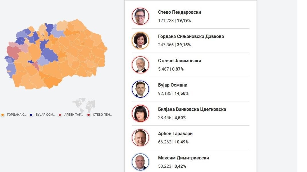 Post Views: 240 Гордана Силјановска Давкова поддржана од ВМРО-ДПМНЕ и Коалицијата Македонија повторно твоја и Стево Пендаровски поддржан од СДСМ и Коалицијата за европска иднина, влегуваат во вториот круг од претседателските избори.Силјановска- Давкова има 362.682 (40,08%) гласови по обработени 99% од гласачките ливчиња , додека Стево Пендаровски има 180.306 (19,93%) гласови.На вчерашниот прв круг од изборите, Сиљановска Давкова, победи во 60 општини во државата, а Пендаrовски освои најмногу гласови во 3, Бујар Османи од ДУИ во 15, а Арбен Таравари од Вреди и Максим...
