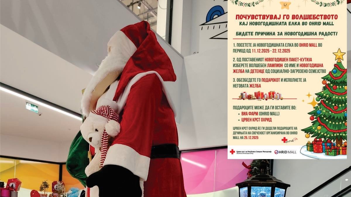 Post Views: 188 Од Црвен крст Охрид информираат дека во полн ек е хуманитарната акција „ВОЛШЕБНА ЕЛКА“ што ја спроведуваат во соработка со OHRID MALL, а наменета е за помош на децата од социјално загрозените семејства. Волшебните лампиони во кои се напишани новогодишни желби на деца што живеат во социјален ризик од Охрид и Дебрца -Ве очекуваат во посебни подготвен новогодишен пакет-кутија веднаш покрај големата новогодишна елка во Ohrid mall, велат организаторите. Тие изразуваат благодарност до голем број наши сограѓани што од почетокот на акцијата на 11.12.2025 до денес...