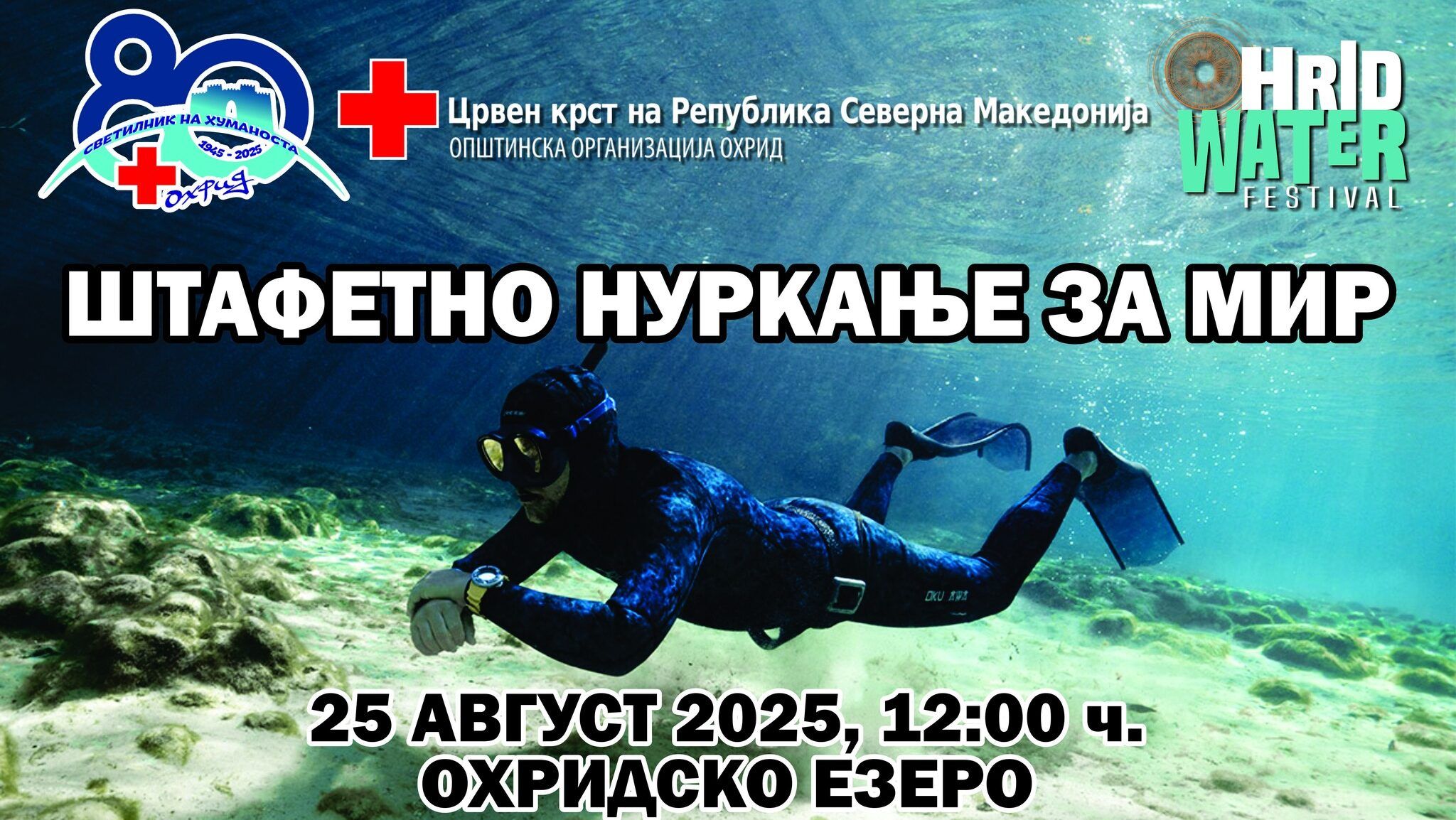 Post Views: 214 По повод одбележувањето на јубилејот 80 години Црвен крст Охрид, а во рамки на овогодинешното издание на Фестивалот на водени спортови Ohrid Water Festival 2025, ќе се одржи меѓународен настан ШТАФЕТНО НУРКАЊЕ ЗА МИР, (пливање под вода-нуркање на здив) во должина од 25 м..Настанот ќе се одржи на Охридското езеро, кај „Старото пристаниште“ (пред х. Палас) на 25.08.2025 г. (понеделник) со почеток во 12 ч.-Ги покануваме сите оние кои се психофизички здрави и се чувствуваат способни за учество на овој, единствен настан од ваков вид во светот, со што од...