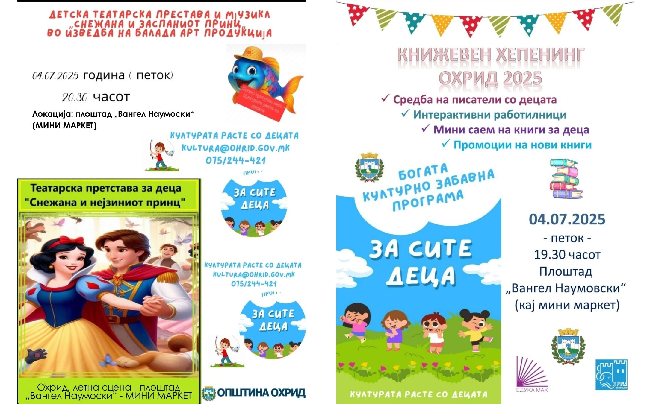 Post Views: 190 Во рамки на проектот Културата расте со децата „За сите деца“ денес на плоштадот „Вангел Наумоски“ ќе се одржи книжевен хепенинг и детска театарска претстава.-Петочна вечер исполнета со култура, фантазија и детска радост! Ве покануваме на две прекрасни случувања за најмладите, на сцената кај плоштадот „Вангел Наумоски“ (мини маркет), велат организаторите.Од 19:30 часот ќе биде одржан Книжевен хепенинг во рамки на кој ќе можат дечињата да ги запознаат авторите на омилените детски книги, да откријат нови изданија, учествуваат во креативни работилници и...