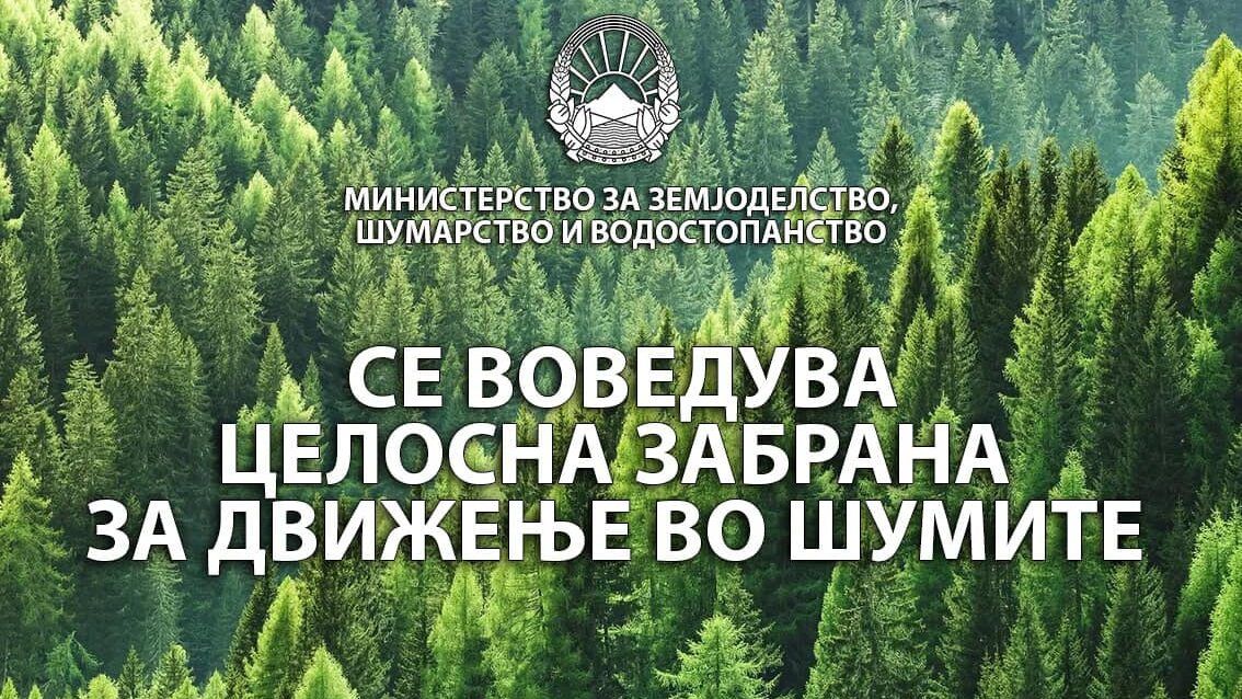 Post Views: 236 Министерството за земјоделство, шумарство и водостопанство по барање на ЈП Национални шуми – Скопје, согласно член 57, став 3 од Законот за шумите, даде согласност за воведување на целосна забрана за движење во шумите и шумското земјиште во периодот од 1 јули до 31 август.Забраната се воведува со оглед на зголемената опасност од појава на шумски пожари на отворен простор.Целосната забрана за движење во шумите и шумското земјиште не важи за Министерството за внатрешни работи, Министерство за одбрана, Шумската полиција, Центарот за управување со...