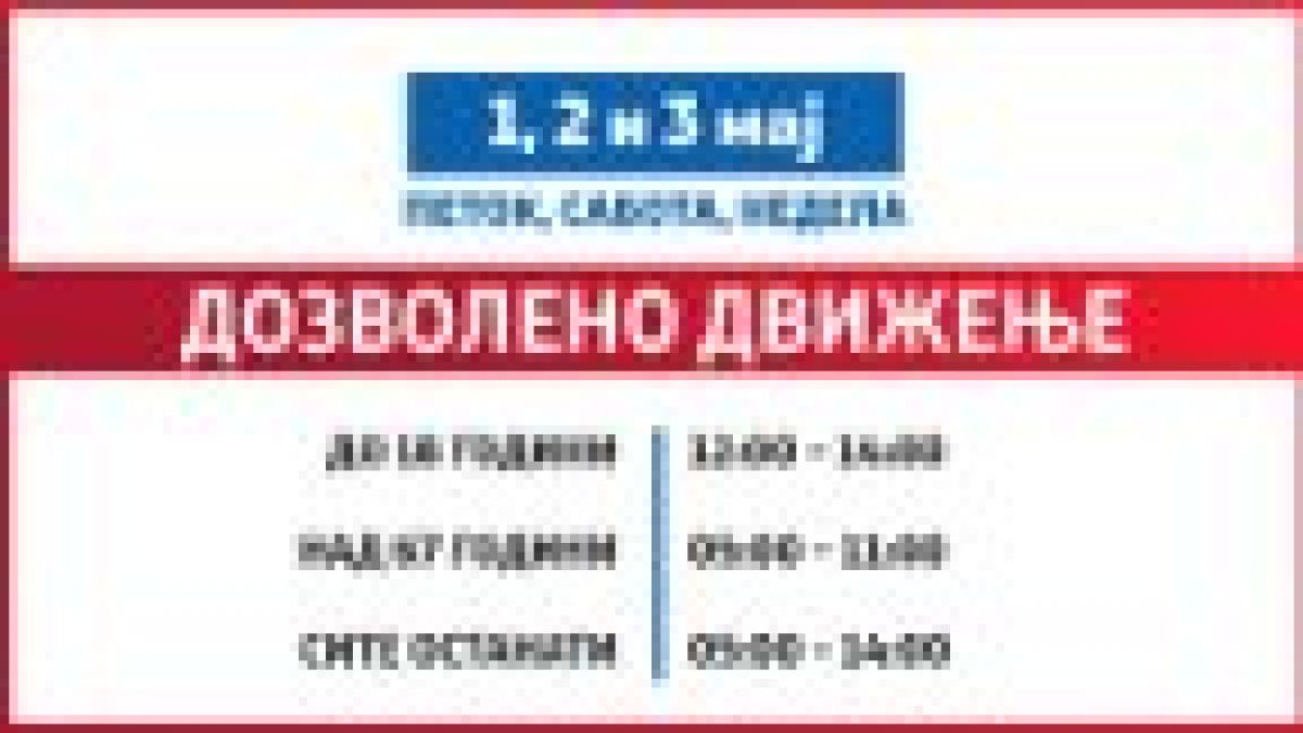 На 1, 2 и 3 мај, односно петок, сабота и недела, ќе биде дозволено движењето на граѓаните од 05:00 часот наутро до 14:00 часот. Забраната за движење во целата држава ќе почнува во 14 часот и ќе трае до 05 часот наутро следниот ден.
