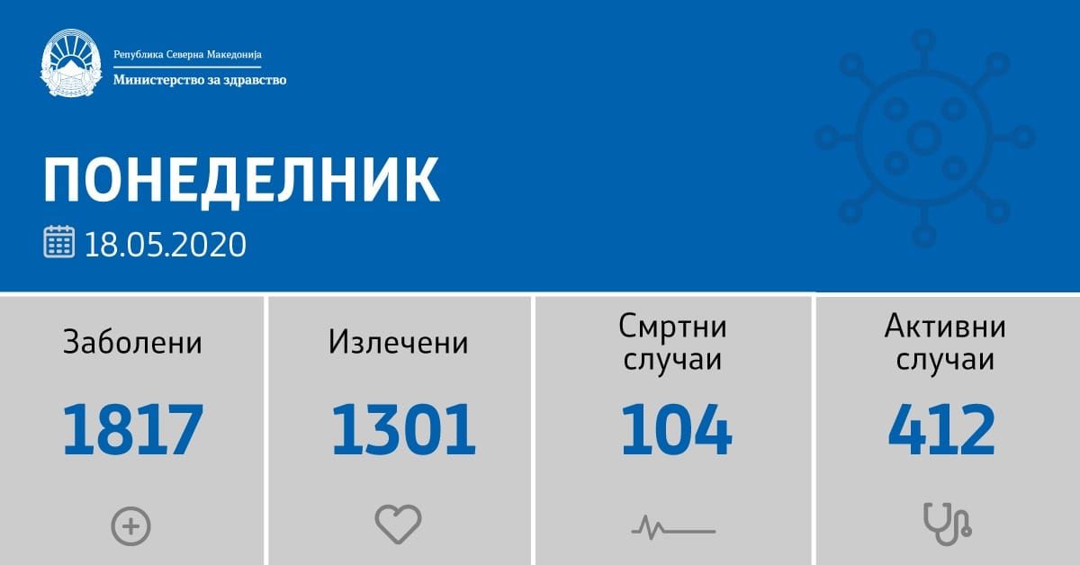 Вкупната бројка на ковид дијагностицирани во нашата земја од почетокот на епидемијата изнесува 1817, бројката на оздравени пациенти е 1301, на починати е 104, а во моментов бројот на активни случаи во земјата изнесува 412.