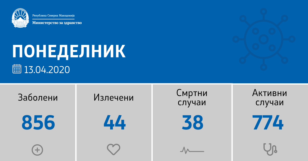 Со ова вкупната бројка на дијагностицирани пациенти со Ковид-19 во нашата земја изнесува 854 лица. Според местото на живеење, досега се регистрирани во: