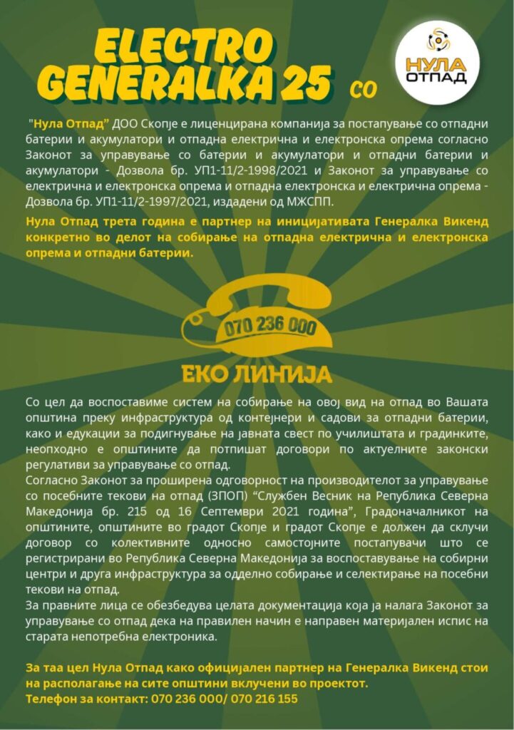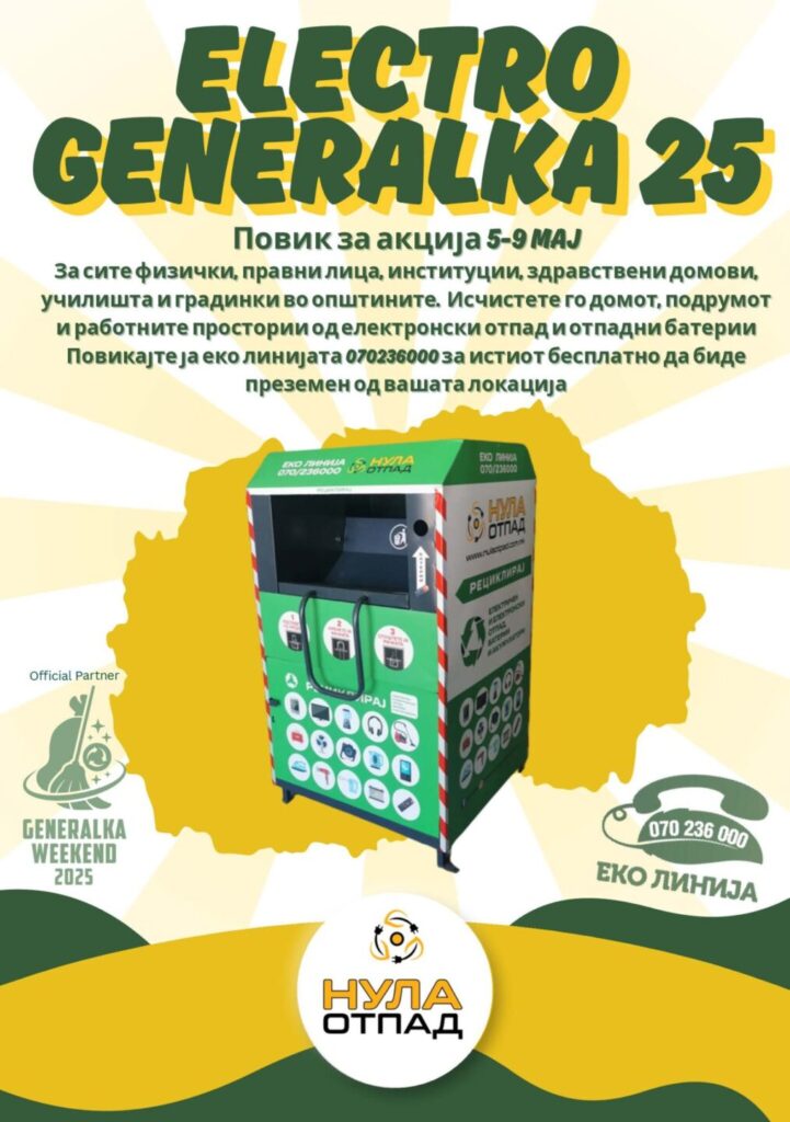 Целта на акцијата е подигнување на еколошката свест за одговорност кон животната средина. За таа цел колективниот постапувач Нула Отпад бесплатно ќе го подигне целиот електронски отпад кој не е во употреба од домаќинствата и правните субјекти (стари печатачи, компјутери, телевизори, телефони, фрижидери, машини за перење и сл.), доколку се јавите на тел: 070 236 000 во период од 5-9 мај 2025 год.