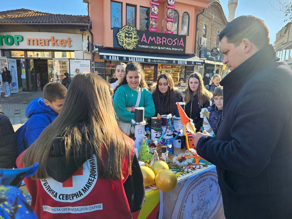Охридските училишта се одзваа на повикот на Црвениот крст и се претставија на штандовите со новогодишни украси, честитки и колачи изработени од вредните ученици, од најмалите основци до средношколците од угостителското училиште. Според нивните наставници ваквите настани им ја доближуваат на децата вистинската магија на празниците, а тоа е дарувањето, емпатијата и солидарноста.