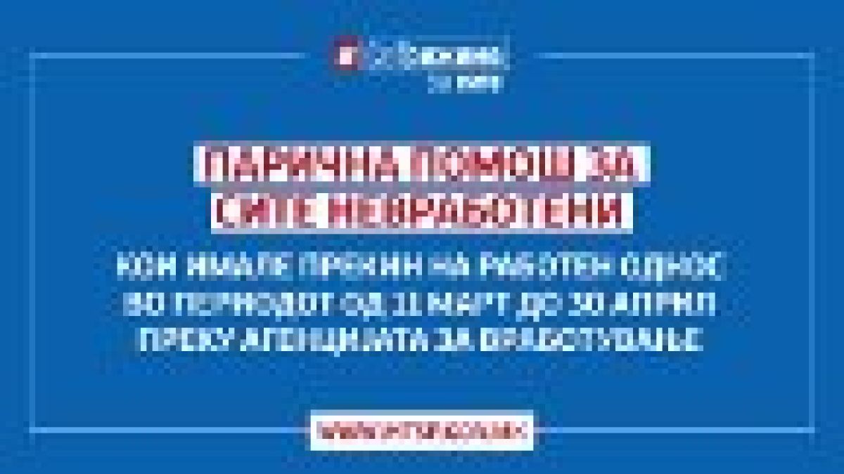 Работниците кои поради корона кризата останале без работа, независно од времето поминато во работен однос, ќе можат брзо да дојдат до помош за полесно да го премостат периодот на невработеност. Тие ќе добиваат паричен надоместок преку Агенцијата за вработување во времетраење од два месеца. Надоместок ќе добиваат невработените лица  на кои работниот однос им престанал во периодот од 11 март до 30 април 2020 година.