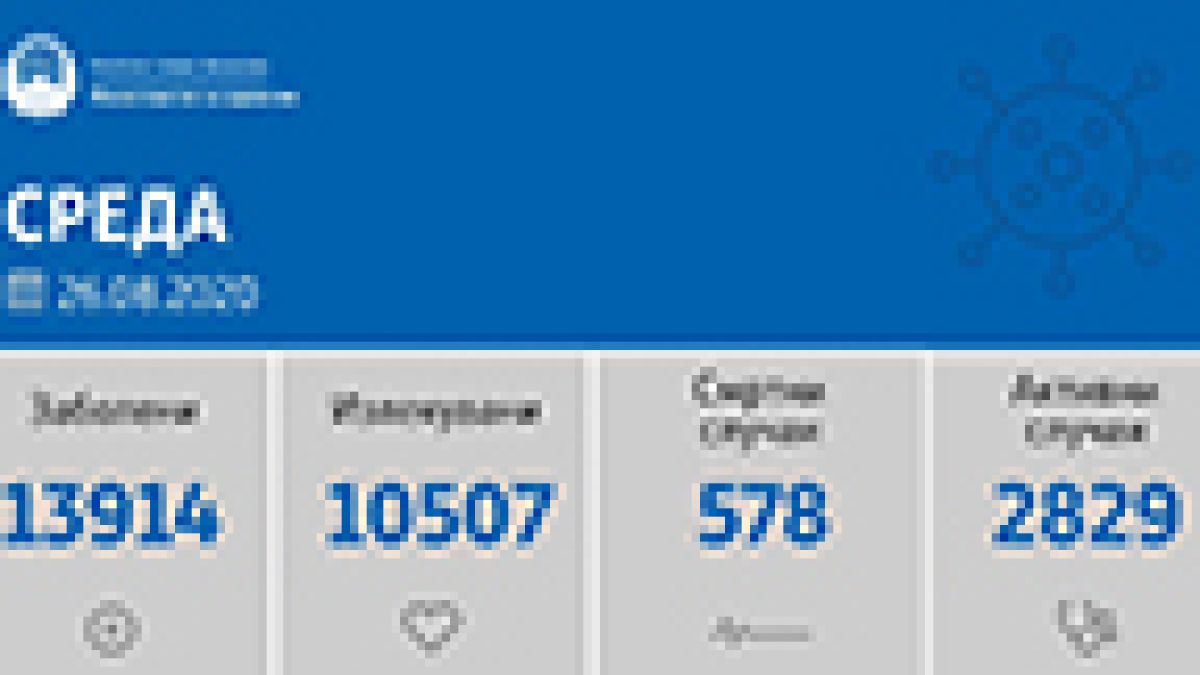 Вкупната бројка на ковид дијагностицирани во нашата земја од почетокот на епидемијата изнесува 13914, бројката на оздравени пациенти е 10507, на починати е 578, а во моментов бројот на активни случаи во земјата изнесува 2829.