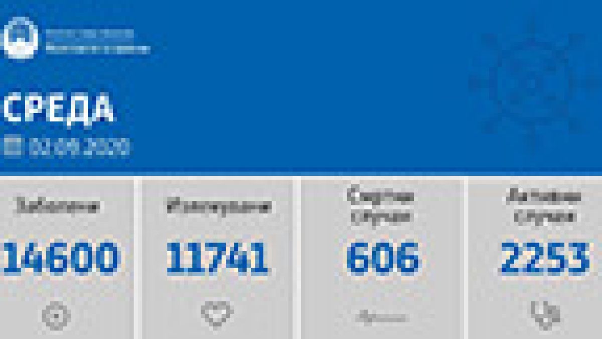 Вкупната бројка на ковид дијагностицирани во нашата земја од почетокот на епидемијата изнесува 14600, бројката на оздравени пациенти е 11741, на починати е 606, а во моментов бројот на активни случаи во земјата изнесува 2253.
