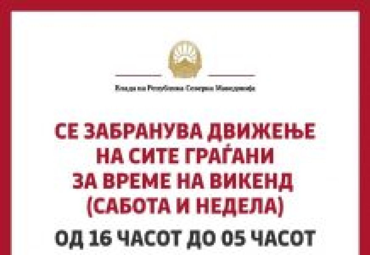 Оваа одлука Владата ја донесе на својата 28-ма седница, одржана на 25 март, во насока за спречување на внесување и ширење на коронавирус Ковид 19. Ова е втор викенд во кој се применува.