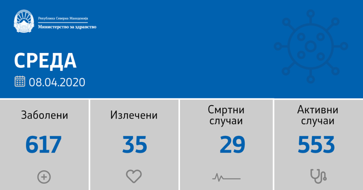 Во изминатите 24 часа, регистрирани се 18 нови случаи, позитивни на коронавирусот. По градови: Скопје – 7, Куманово – 2, Прилеп – 4, Битола – 2, Кавадарци -1 (починатиот), Крушево – 1 и Кочани -1. Со ова вкупната бројка на дијагностицирани пациенти со Ковид-19 во нашата земја изнесува 617 лица.