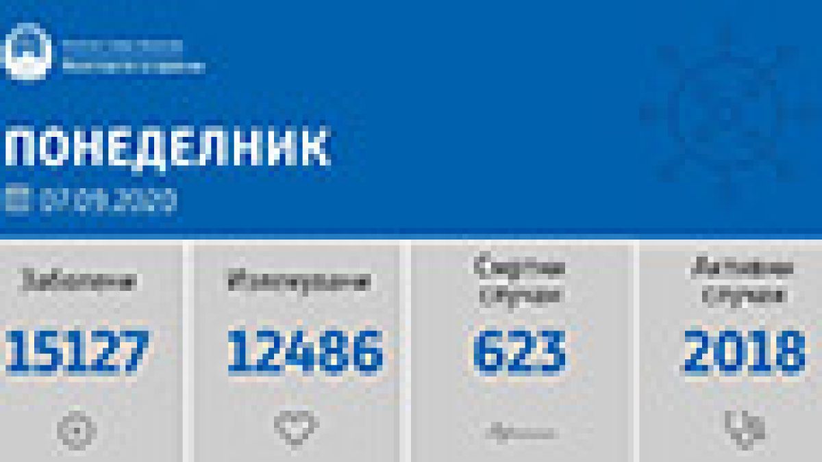 Вкупната бројка на ковид дијагностицирани во нашата земја од почетокот на епидемијата изнесува 15127, бројката на оздравени пациенти е 12486, на починати е 623, а во моментов бројот на активни случаи во земјата изнесува 2018.