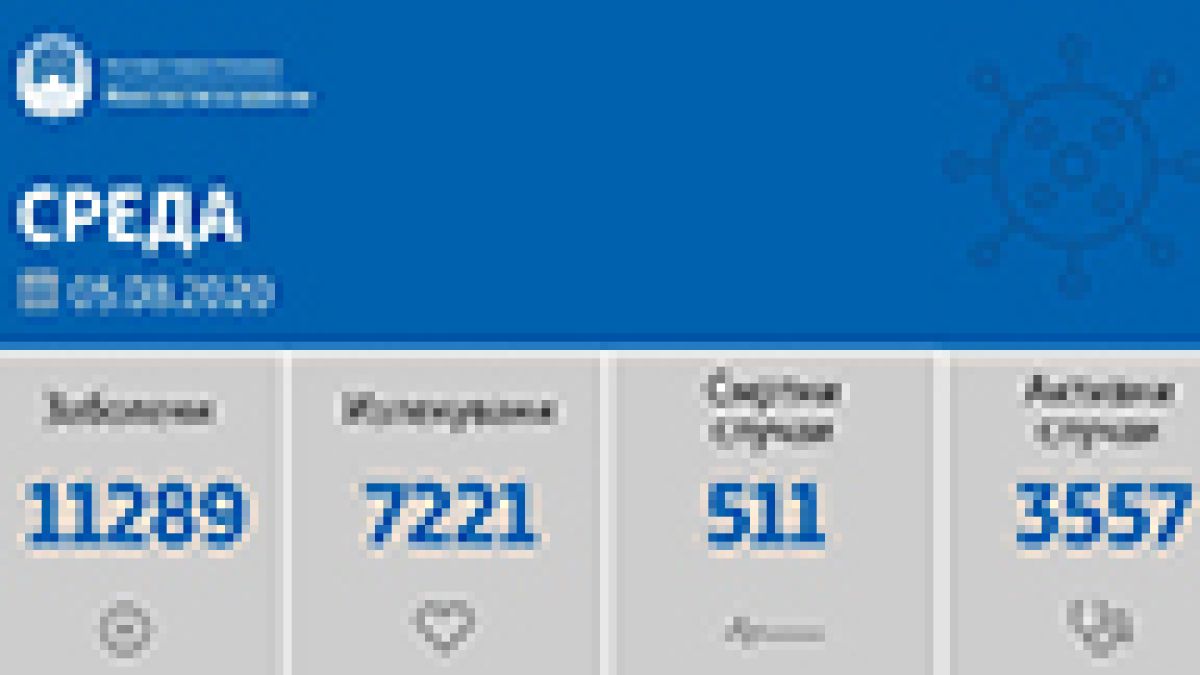Вкупната бројка на ковид дијагностицирани во нашата земја од почетокот на епидемијата изнесува 11289, бројката на оздравени пациенти е 7221, на починати е 511, а во моментов бројот на активни случаи во земјата изнесува 3557.