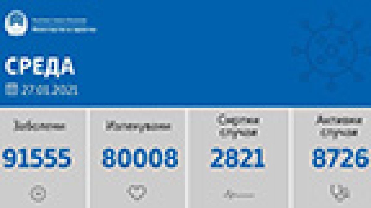 Вкупната бројка на ковид дијагностицирани во нашата земја од почетокот на епидемијата изнесува 91555, бројката на оздравени пациенти е 80008, на починати е 2821, а бројот на активни случаи изнесува 8726.Досега во земјата се направени вкупно 448.031 тестирања на Ковид -19.
