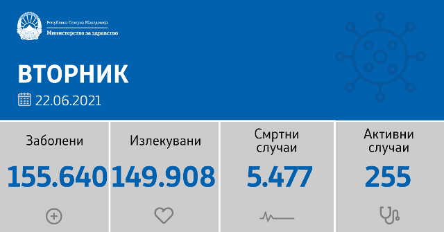 Вкупната бројка на COVID-19 дијагностицирани лица во нашата земја од почетокот на епидемијата изнесува 155.640, бројката на оздравени пациенти е 149.908, на починати е 5.477, а бројот на активни случаи изнесува 255.