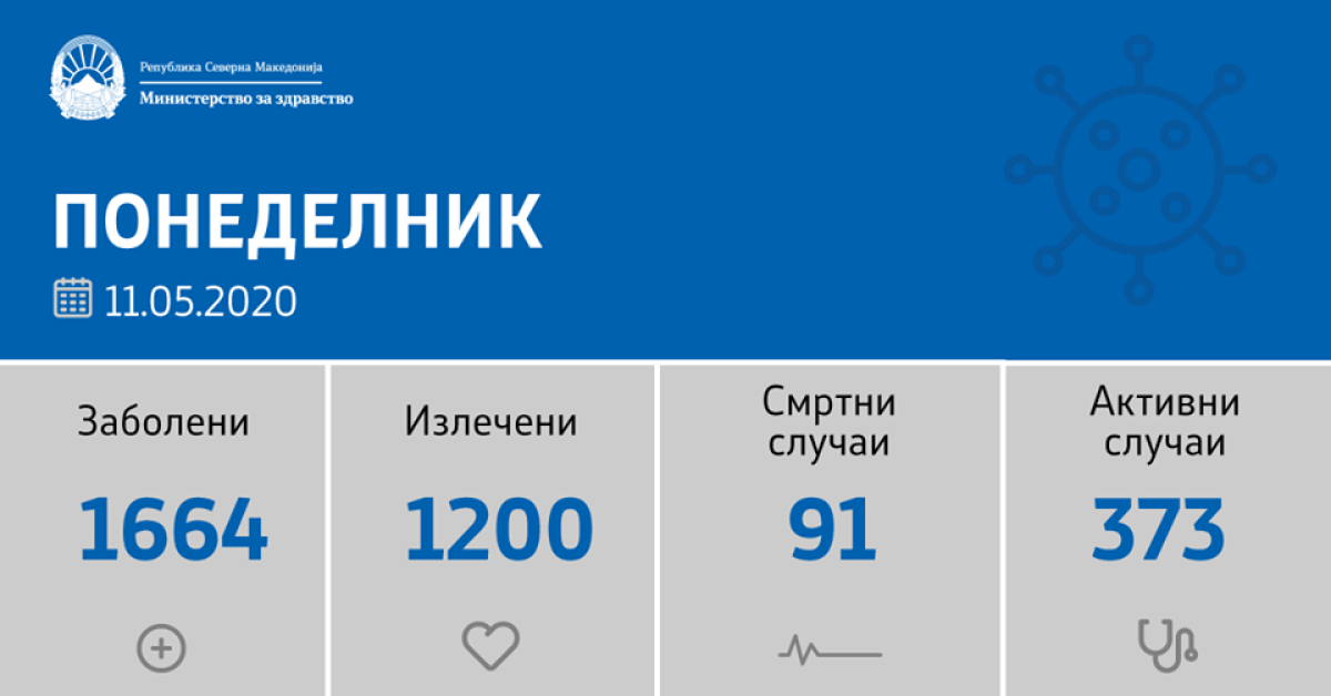Вкупната бројка на ковид дијагностицирани во нашата земја од почетокот на епидемијата изнесува 1664, бројката на оздравени пациенти е 1200, на починати е 91, а во моментов бројот на активни случаи во земјата изнесува 373.