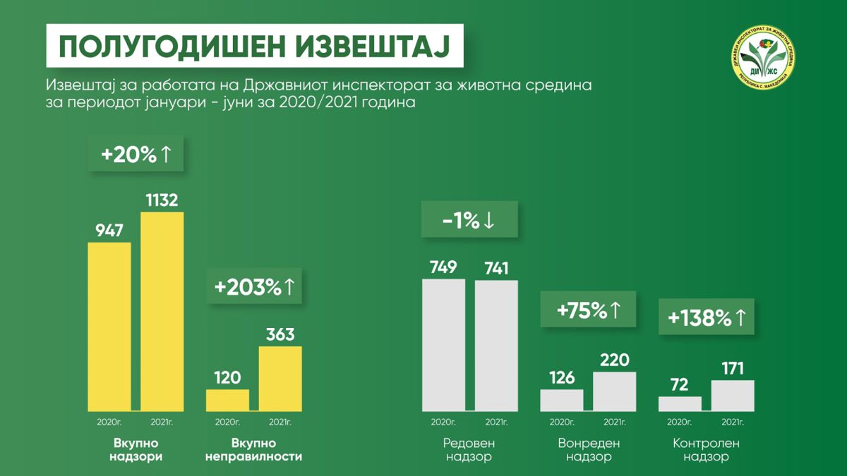 Во периодот јануари-јуни 2021 година, наместо планираните 866 инспекциски надзори, реализирани се 1.132 инспекциски надзори, или 30% повеќе од планираното. Во 2020 година биле реализирани вкупно 947 инспекциски надзори, односно во 2021 година се реализирани 185 надзори повеќе, или забележан е раст од 20%, стои во полугодишниот извештај на Државниот инспекторат за животна средина