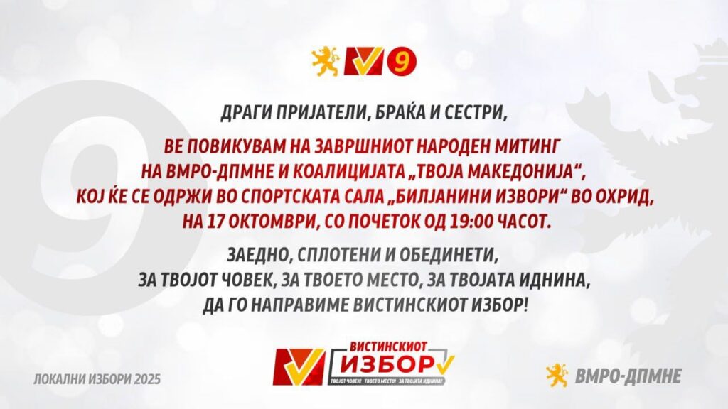 Митингот ќе се одржи во Спортската сала „Билјанини извори“, а започнува во 19 часот.