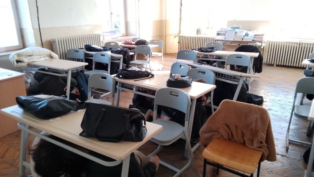 -Според однапред утврдено сценарио, учениците предводени од своите класни раководители и координирани од останатите професори и вработени, внимателно ги проследија инструкциите за евакуација во случај на земјотрес.Ваквите показни вежби ги подготвуваат учениците, професорите и другите вработени да можат најсоодветно да изреагираат во евентуална кризна ситуација.- информираат од училиштето.