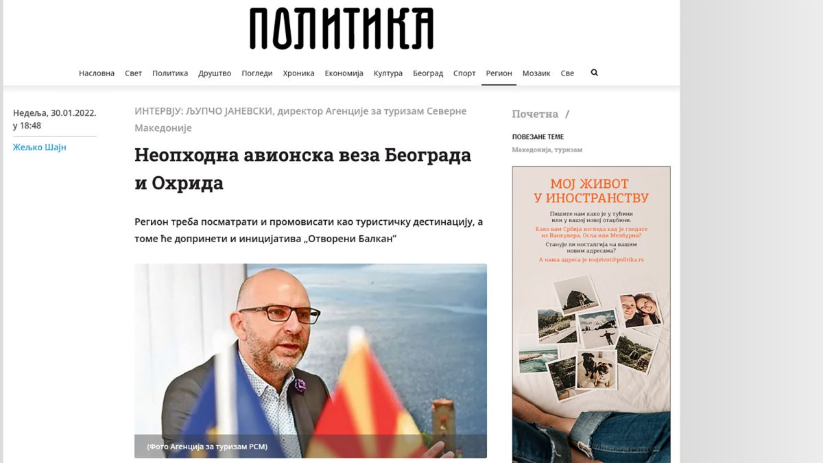 Во вчерашното издание на српскиот весник Политика, директорот на АППТ, д-р Љупчо Јаневски после две години прави осврт и споредба на движењето на туристичката индустрија од почетокот на пандемијата до сега. При самиот почеток на пандемијата со Ковид 19, Јаневски изјави за Политика дека треба да се гради заеднички, регионален пристап за да зацели туристичката индустрија. Две години подоцна, туризмот почнува да ги регистрира првите резултати и да закрепнува.