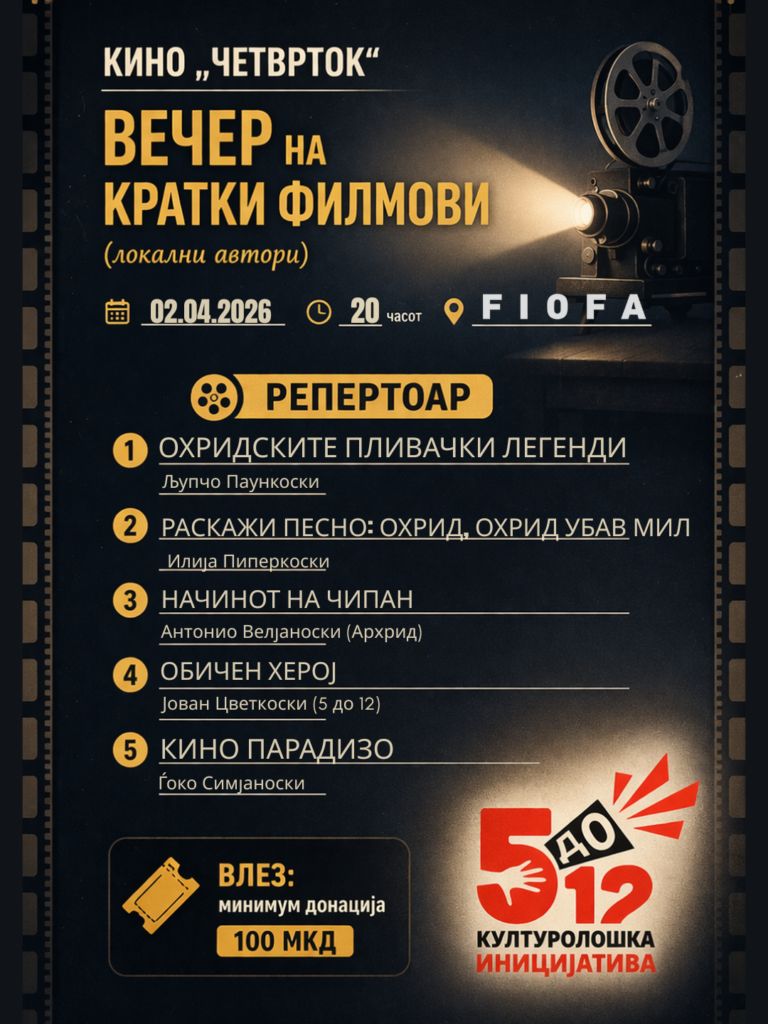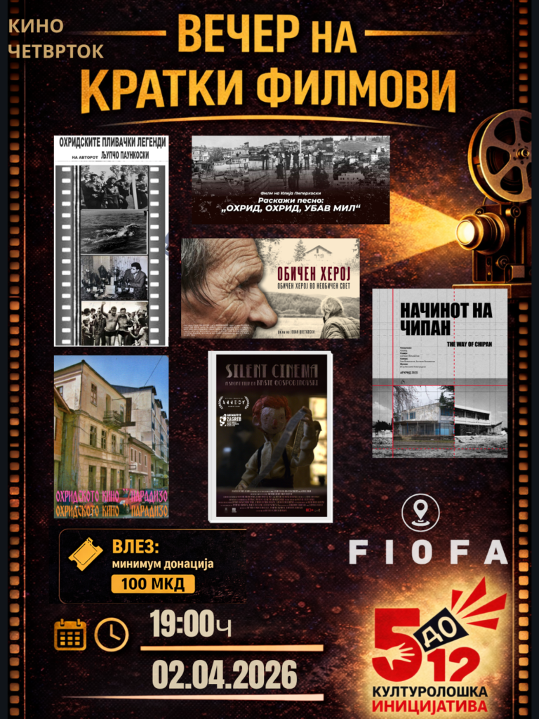 Во четврток, 2 априлм со почеток од 19 часот во просториите на Филмскиот институт ФИОФА – Охрид, во рамки на програмата на КИНО „ЧЕТВРТОК“, ќе се одржи „ВЕЧЕР НА КРАТКИ ФИЛМОВИ“, посветена на локалните автори и нивните филмски приказни.
