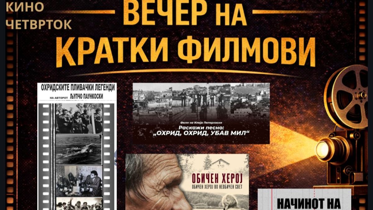 Во четврток, 2 априлм со почеток од 19 часот во просториите на Филмскиот институт ФИОФА – Охрид, во рамки на програмата на КИНО „ЧЕТВРТОК“, ќе се одржи „ВЕЧЕР НА КРАТКИ ФИЛМОВИ“, посветена на локалните автори и нивните филмски приказни.