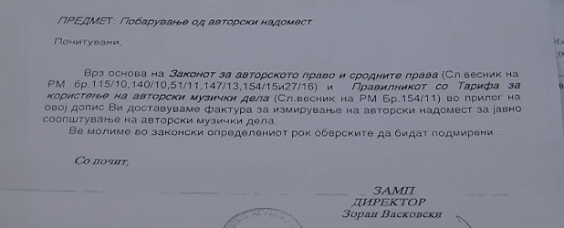 Според измените и надоплнувањата на Законот за авторски права и сродни права од  десетти февруари 2016та година, приватните станоиздавачи на Здружението за заштита на авторските музички права,ЗАМП,треба да му исплатат износ од шест илјади денари, реагираат од Општинската организација на СДСМ од Охрид.
