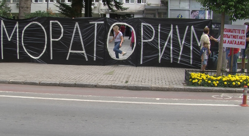 Градските советници  денеска  во општинската зграда влегуваа низ огромен банер на кој пишуваше МОРАТОРИУМ. Влезот го преуредија активисти од Граѓанската иницијатива Охрид SOS и здружението Стар Лагадин.  Симболиката е дека советниците минуваат и воопшто не го гледаат мораториумот, кажаа граѓаните и активистите за заштита на Охрид и охридскиот регион кои се собраа на мирен протест пред општината додека во салата се одржуваше закажаната 14та седница на совет. Тие бараат мораториумот на градење на охридското крајбрежје согласно  препораката на УНЕСКО итно да биде спроведен  од страна на Општината.