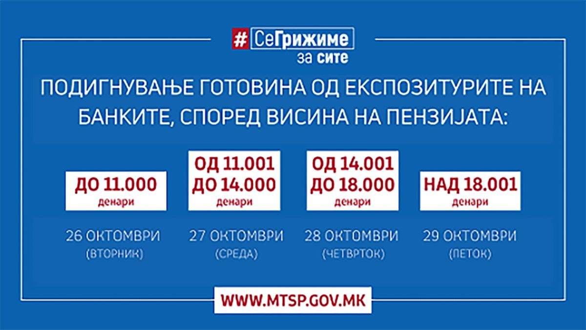 Министерството за труд и социјална политика известува дека денеска 26.10.2021 год. (вторник) започна етапната исплата на октомвриските пензии. Пензиите ќе бидат исплатени предвреме и етапно, со цел да се овозможи поголема заштита на пензионерите во услови на опасност од коронавирусот КОВИД-19.