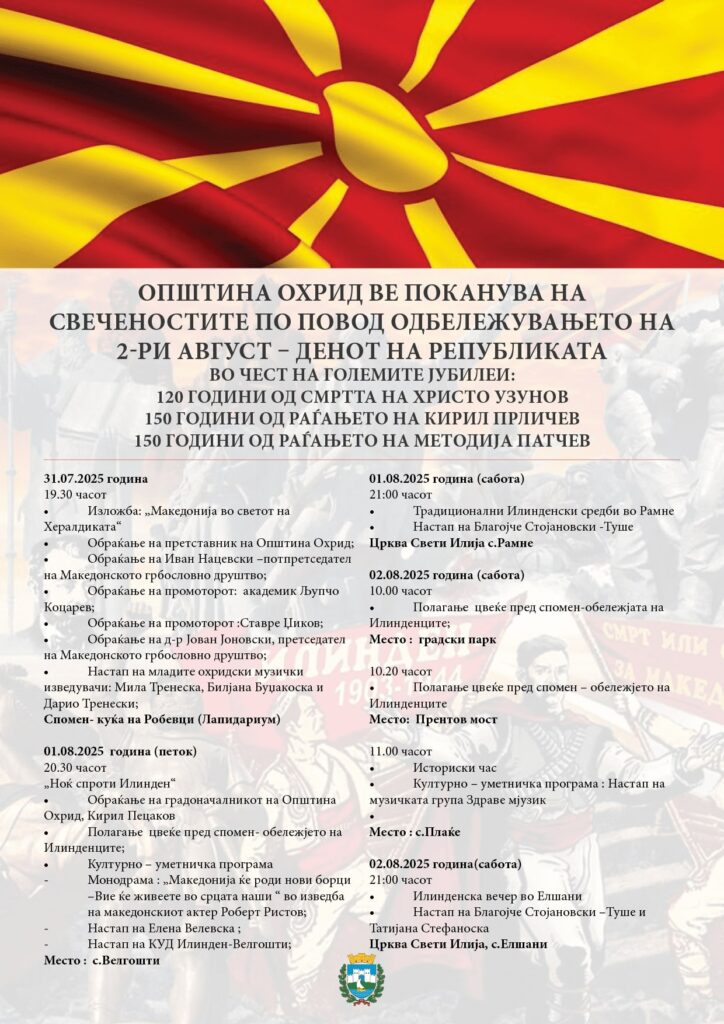 Општина Охрид со свечена програма ќе го одбележи 2 август – Денот на Републиката. Настаните се и во чест на трите големи јубилеи – 120 години од смртта на Христо Узунов, 150 години од раѓањето на Кирил Прличев и 150 години од раѓањето на Методија Патчев.