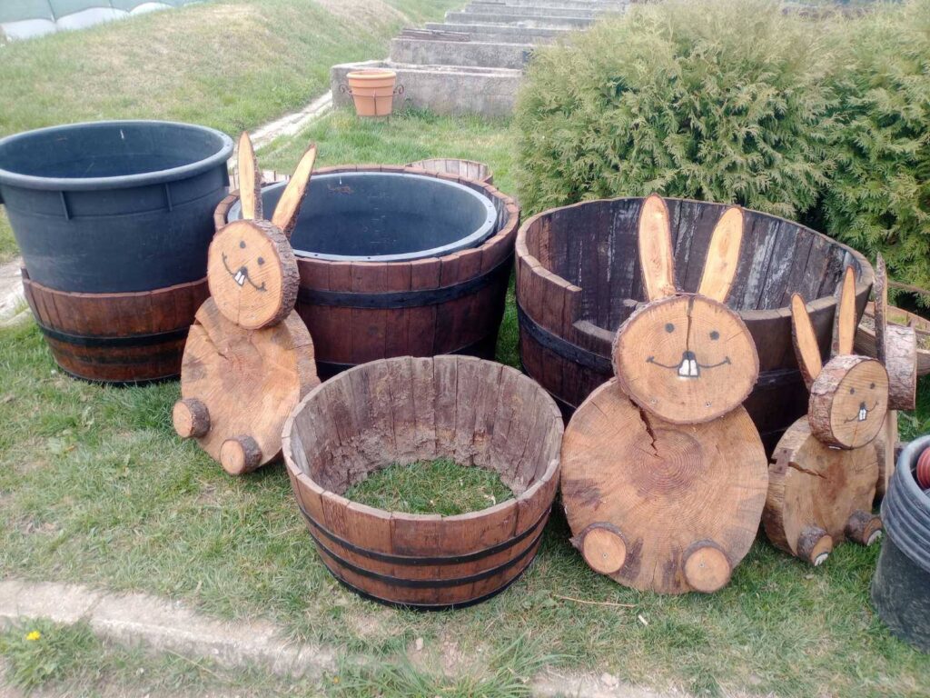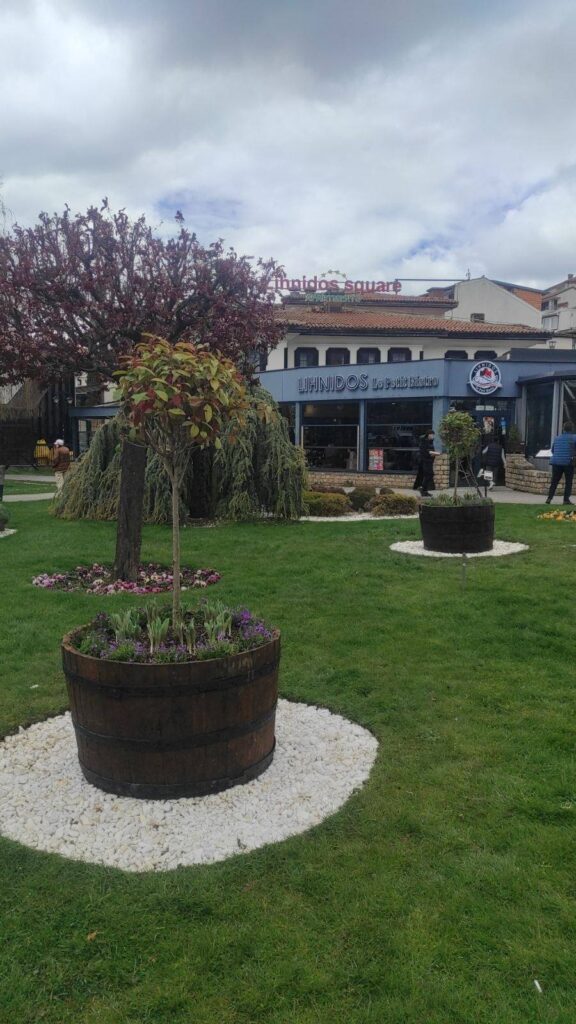 Вработените направија саксии од стари дрвени буриња каде се засадени пролетни цвеќиња од видот кампанула, декоративна црвена фотинија, во комбинација со декоративен бел камен.