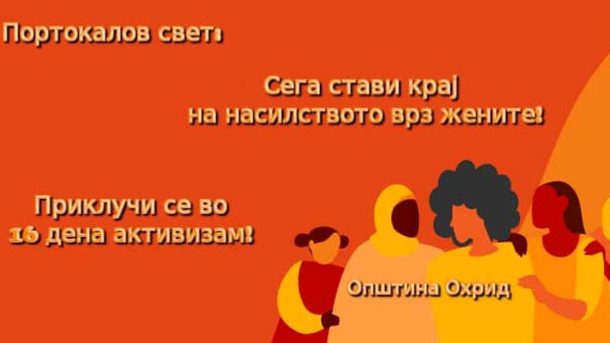 Обој го светот портокалово: КРАЈ НА НАСИЛСТВОТО ВРЗ ЖЕНИТЕ СЕГА! Кампања 16 дена активизам против насилството врз жените и девојчињата која започнува денес, 25 Ноември – Меѓународниот ден на елиминација на насилството врз жените, а трае до 10 Декември – Денот на човековите права. Зградата на Општина Охрид симболично има да биде осветлена во портокалова боја со цел симболизирање посветла иднина во која нема место за насилство – вели градоначалникот Кирил Пецаков.
