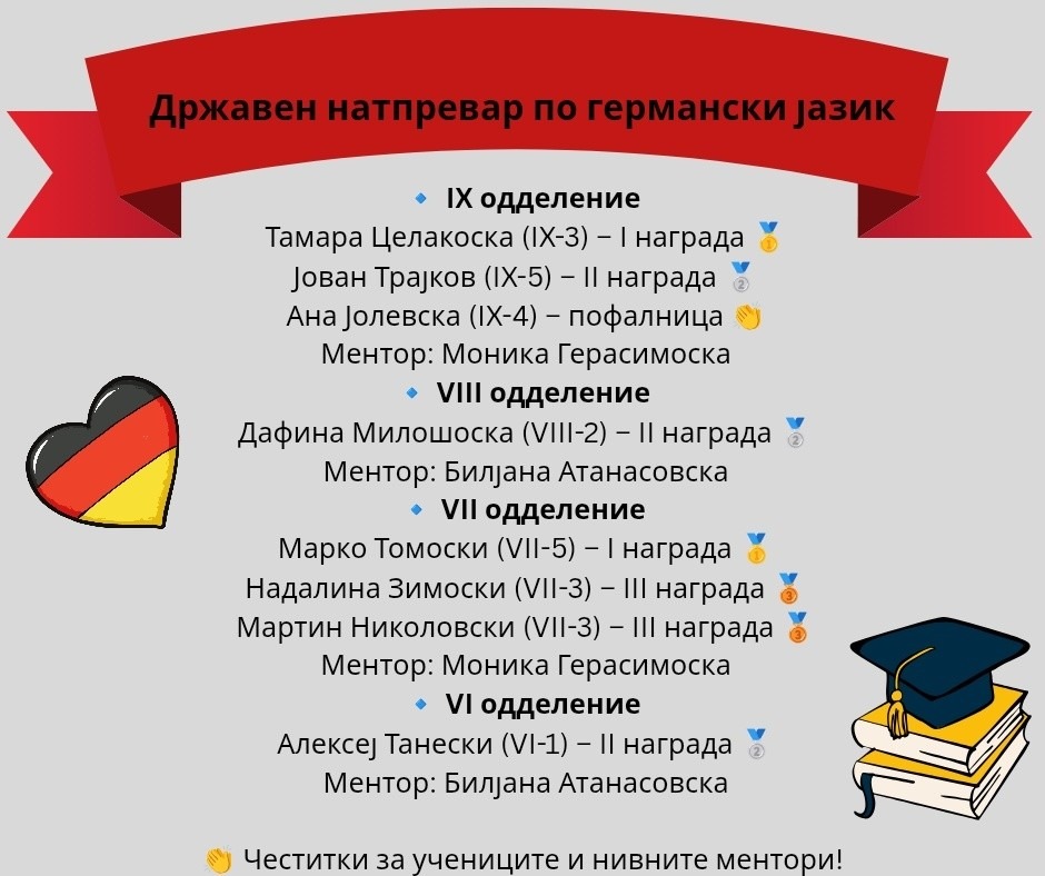 На 14.03.2026 година во Прилеп се одржа Државниот натпревар по германски јазик, на кој учениците од ООУ „Григор Прличев“ уште еднаш ги покажаа своите знаења, вештини и љубов кон изучувањето на странските јазици.